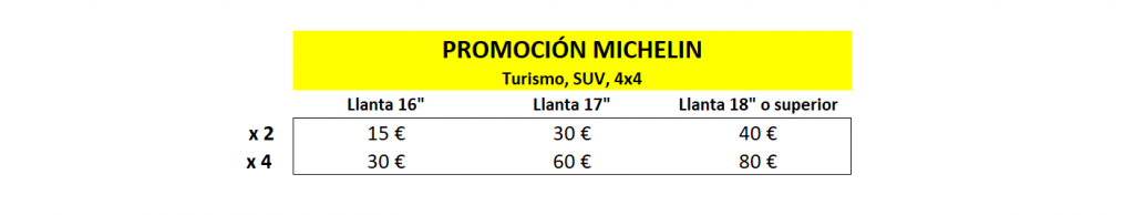 Per la compra i el muntatge de 2 o 4 pneumàtics MICHELIN per a turisme/SUV o 4×4, de llanta 16”, 17”, 18”, 19” o superior, l’usuari podrà triar com a regal Xec Carburant, Targeta Regal Decathlon o Targeta Regal d’El Corte Inglés, per valor des de 10 € fins a 80 € com a màxim.