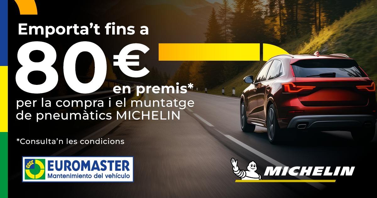 Del 20 d’octubre al 16 de novembre de 2025, aprofita la promoció exclusiva d’EUROMASTER i MICHELIN que et premia per cuidar el teu vehicle i conduir amb la màxima seguretat.